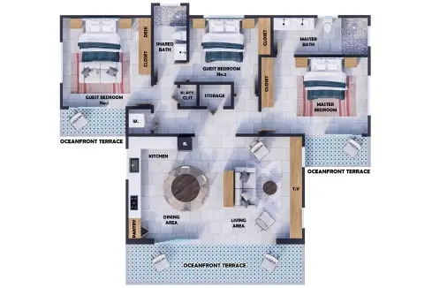 Discover the ultimate luxury beachfront home experience with the Bela Apollo Model, named after the Greek god of sun and light. These models are designed to offer a unique and comfortable lifestyle, blending modern design with sustainable principles. Enjoy the perfect living space, complete with three bedrooms (one master bedroom with private bath and two guest bedrooms sharing a bathroom), full kitchen with dining room and pantry as well as an amazing oceanfront terrace.